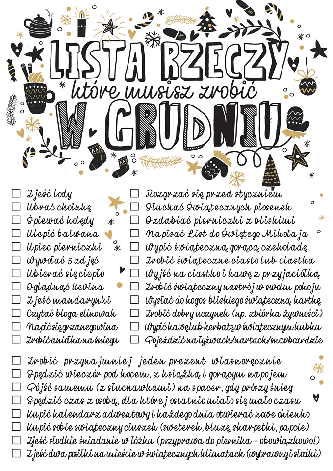 Dodawajcie zdjęcia/filmiki z wykonanymi zadaniami na InstaStory lub na swoje profile. Oznaczajcie mnie (@elinowak) i dodawajcie hashtag #grudzien_z_eli 😊 Czy lista rzeczy, które musisz zrobić w grudniu przebije jesienną edycję? Coś czuję, że tak! 🤩 Czekam na światełka, Wasze cudowne śniadania, pierniczki, zdjęcia ze spacerów i na… aniołki na śniegu! Nie ukrywam, że tego nie mogę się doczekać najbardziej! 😁 Tym razem też najbardziej aktywne osoby dostaną ode mnie nagrody niespodzianki! 😊